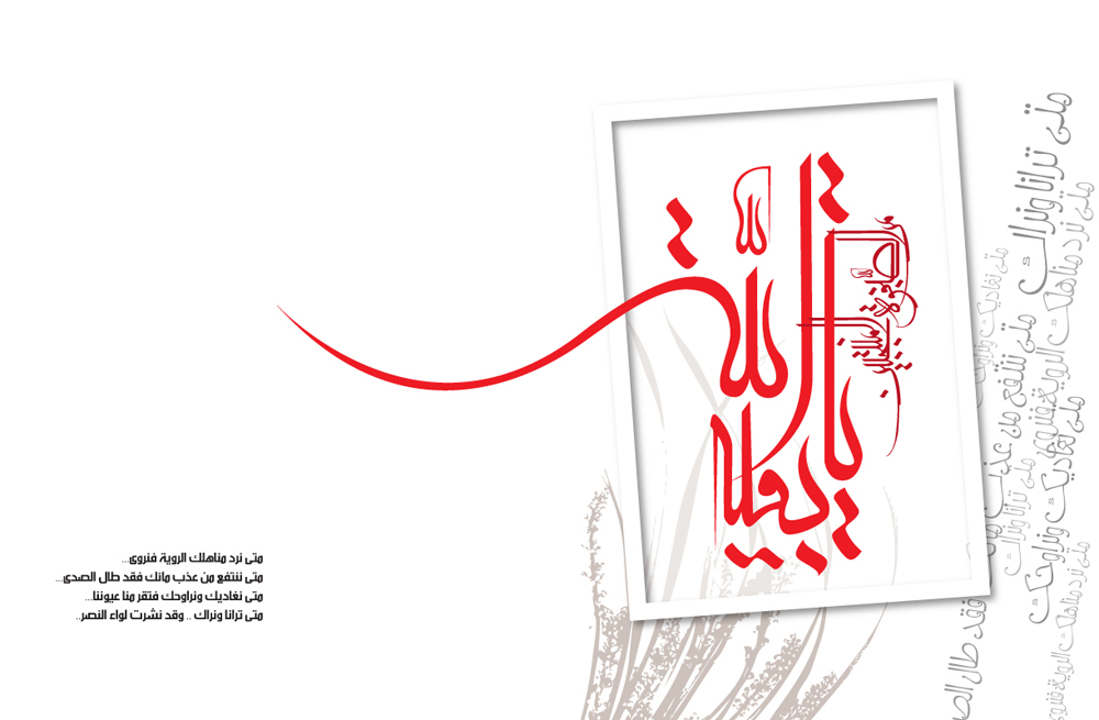 به نام خداوند بخشنده مهربان بار الها: ولی امرت امام زمان حجت بن الحسن را که درودهایت بر او وپدرانش باد در این هنگام وبرای همیشه سرپرست ونگهدار ورهبر ویاور وراهنما ونگاهبان باش تا گیتی را به فرمان او آوری وتا دیر زمان، بهره مندش گردانی | اَللّـهُمَّ کنْ لِوَلِیک الْحُجَّةِ بْنِ الْحَسَنِ صَلَواتُک عَلَیهِ وَعَلی آبائِه فی هذِهِ السَّاعَةِ وَفی کلِّ ساعَة وَلِیاً وَحافِظاً وَقائِداً وَناصِراً وَدَلیلاً وَعَیناً حَتّی تُسْکنَهُ اَرْضَک طَوْعاً وَتُمَتِّعَهُ فیها طَویلاً